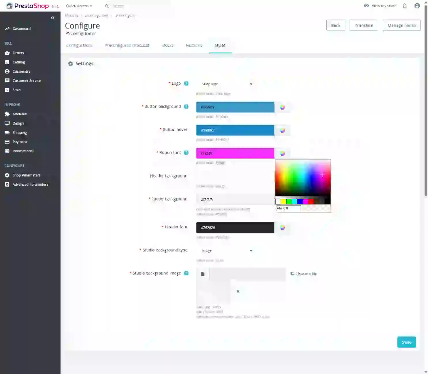 Transform any of your products into a beautiful interactive configurator directly from your Prestashop Backend.