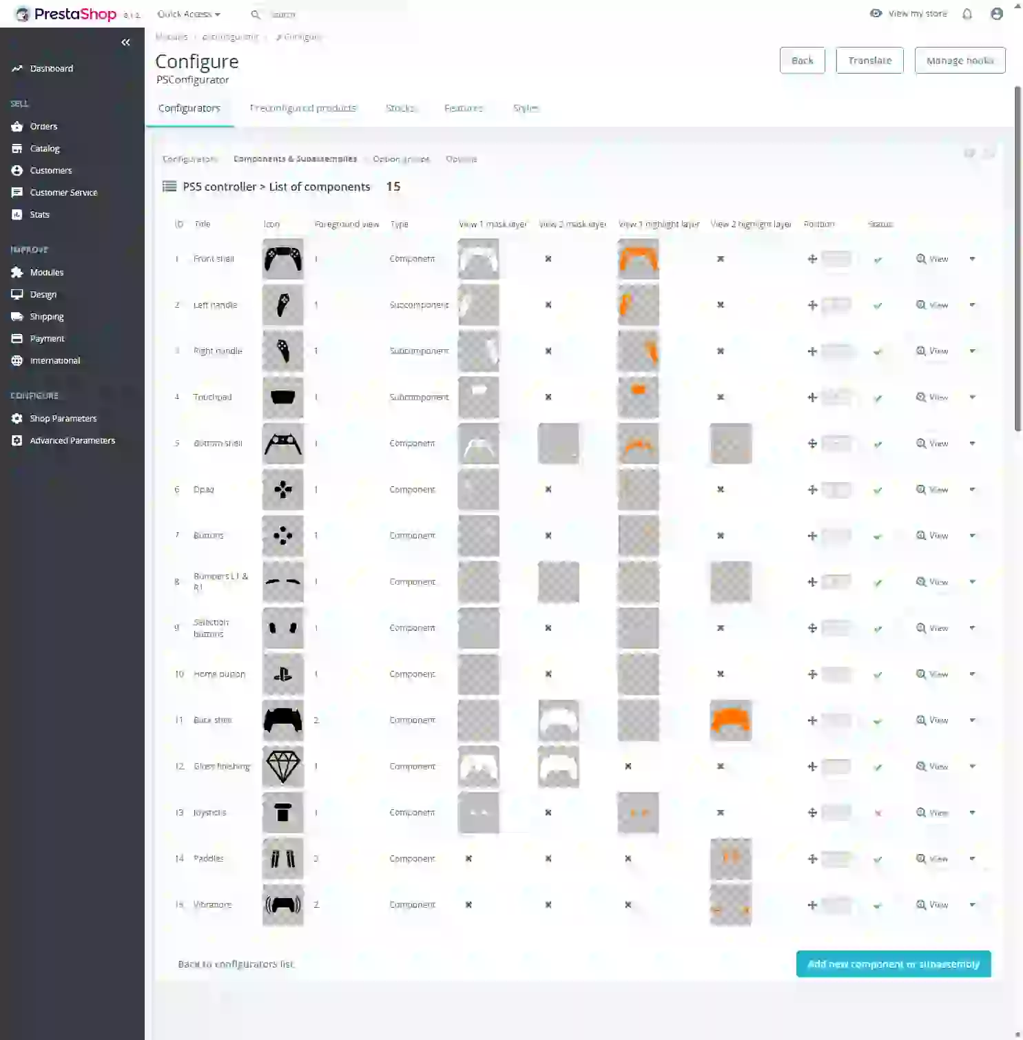At the core of PSConfigurator is a powerful component-based configuration system. It allows merchants to split a product into multiple customizable zones, called components and sub-components. Each component can be configured independently, making it possible to build extremely advanced and flexible product configurators. This approach enables merchants to create complex customizable products while keeping the interface intuitive and easy to use for customers.