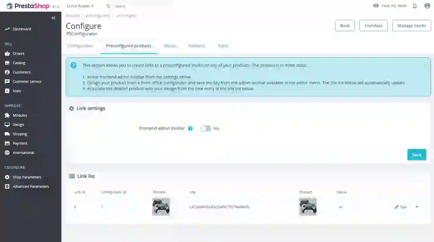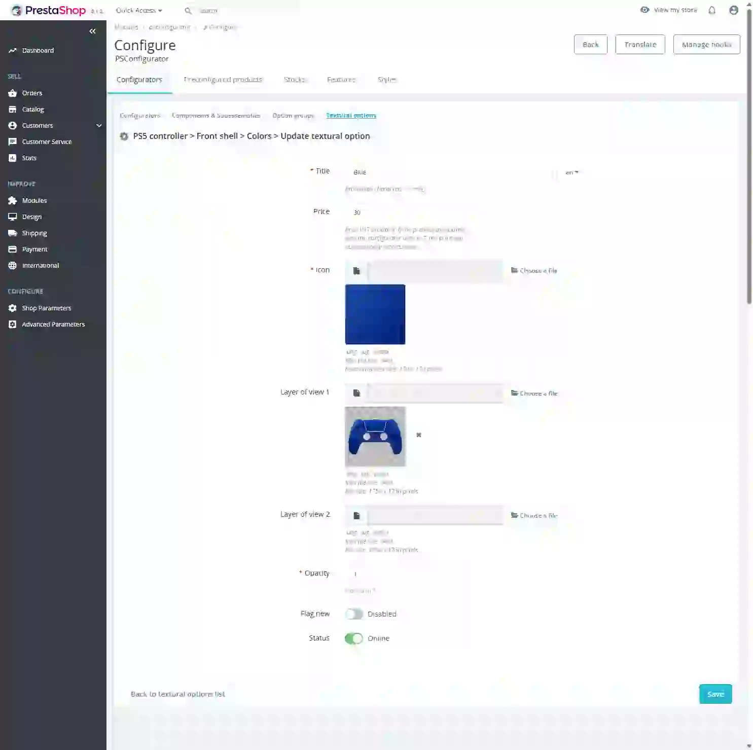PSConfigurator is a powerful PrestaShop Product Configurator module that allows merchants to create fully customizable products and boost online sales. This all-in-one PrestaShop product customization tool enables customers to personalize products in real time and instantly generate customized quotes.